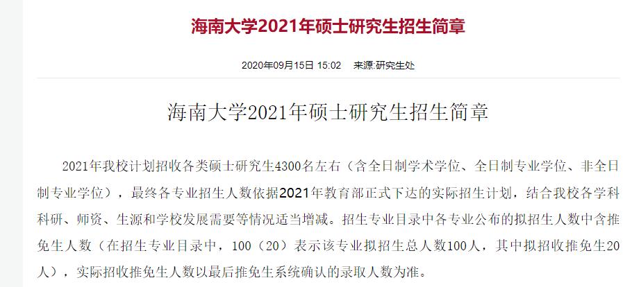 考研院校公告:海南大學2021年與2020年考研招生人數信息變動解析