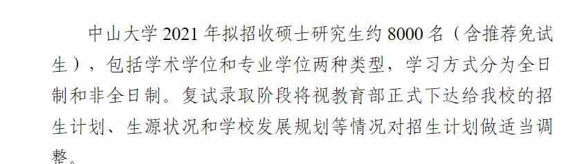 中山大學(xué)2020年研究生招生計(jì)劃約為7000名,2021年招生計(jì)劃約為8000名,同比增長(zhǎng)1000人。