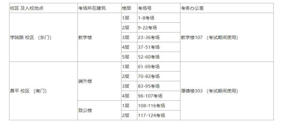 我考點(diǎn)考場(chǎng)分布在學(xué)院路校區(qū)教學(xué)樓及昌平校區(qū)端升樓、致公樓(具體分布見(jiàn)表1)。