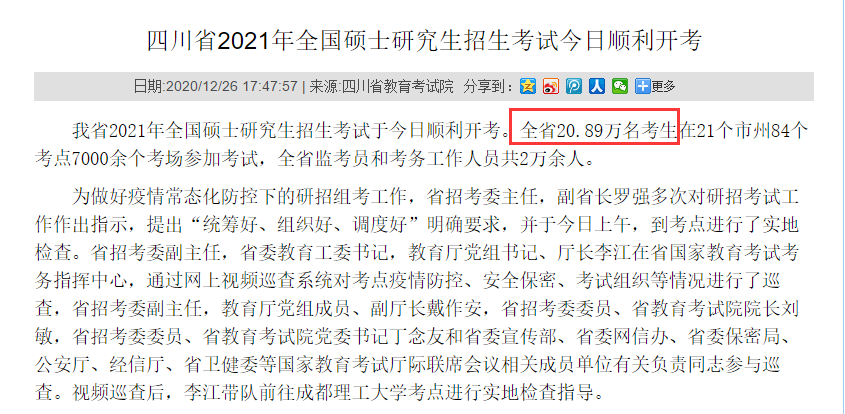 12月26日,四川省公布的文件中顯示:2021年四川省共有20.89萬名考生參加全國(guó)碩士研究生招生考試!