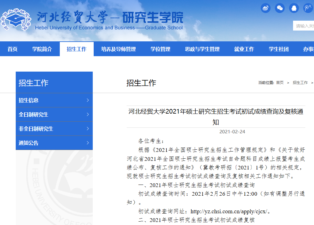以上就是小編整理“2021考研初試成績:河北經貿大學考研初試成績查詢入口開啟!初試成績已公布!”的全部內容,想了解更多相關信息請持續關注本網站。