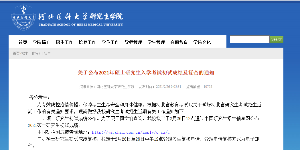 2021考研初試成績:河北醫科大學考研初試成績查詢入口開啟!初試成績已公布!
