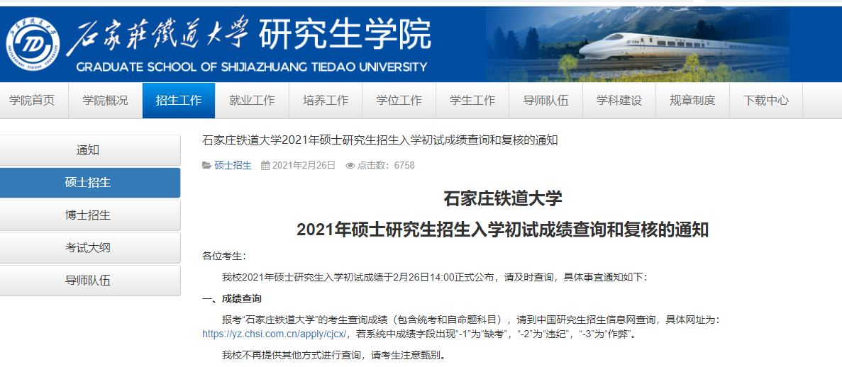 石家莊鐵道大學考研初試成績查詢入口:https://yz.chsi.com.cn/apply/cjcxa/