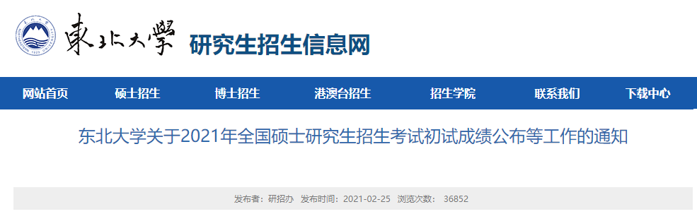 以上就是小編整理“2021考研初試成績:東北大學考研初試成績查詢?nèi)肟陂_啟!初試成績已公布!”的全部內(nèi)容,想了解更多相關信息請持續(xù)關注本網(wǎng)站。