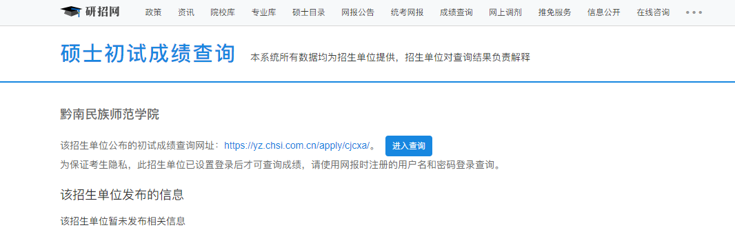 黔南民族師范學院考研初試成績查詢入口:https://yz.chsi.com.cn/apply/cjcx/sch/10670.dhtml
