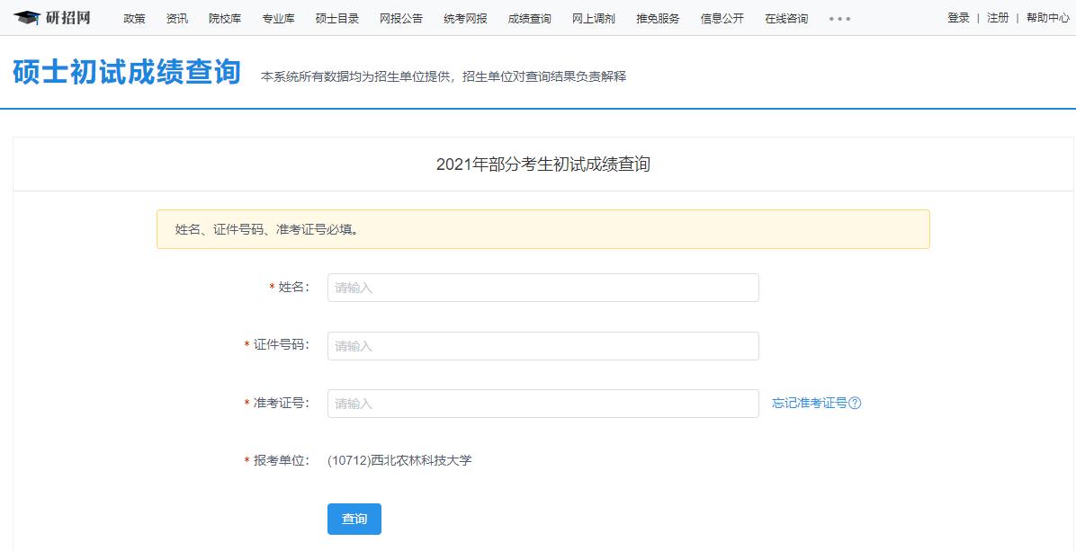 西北農(nóng)林科技大學(xué)考研初試成績(jī)查詢?nèi)肟?/span>:https://yz.chsi.com.cn/apply/cjcx/t/10712.dhtml