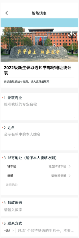 所有被錄取的新生,務(wù)必于2022年6月25日(星期六)前將本人能夠接收到錄取通知書的郵寄地址,通過釘釘軟件平臺(tái)的“智能填表”進(jìn)行報(bào)送。“智能填表”的具體操作示例如下: