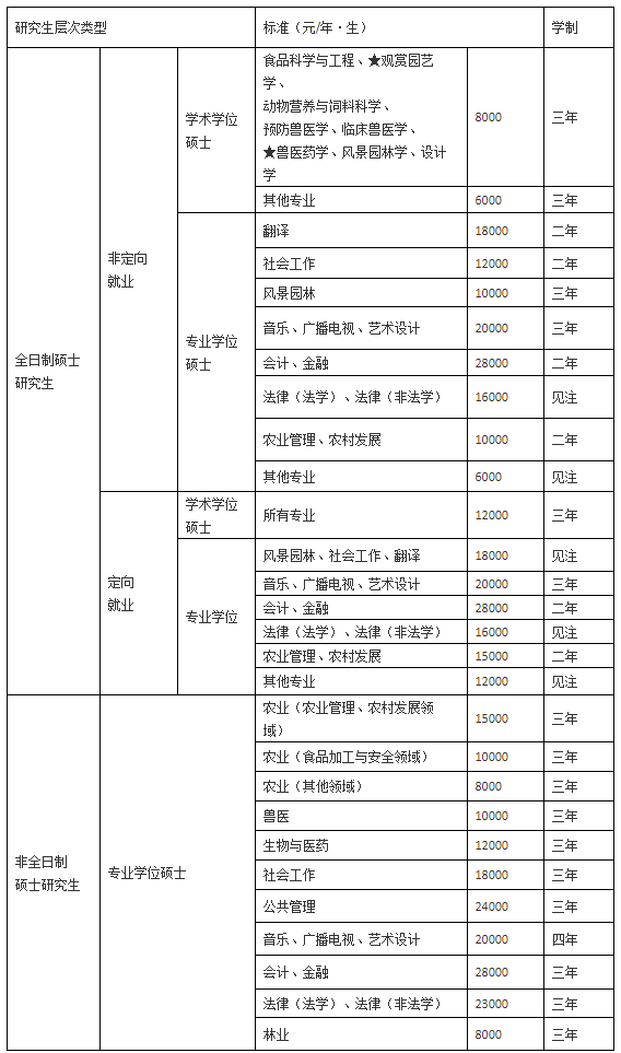 注:風景園林、農藝與種業、資源利用與植物保護、畜牧、漁業發展、食品加工與安全、農業工程與信息技術、林業、電子信息、機械、生物與醫藥、工程管理、法律(非法學)等類別(領域)學制為三年;翻譯、社會工作、法律(法學)等類別(領域)學制二年。