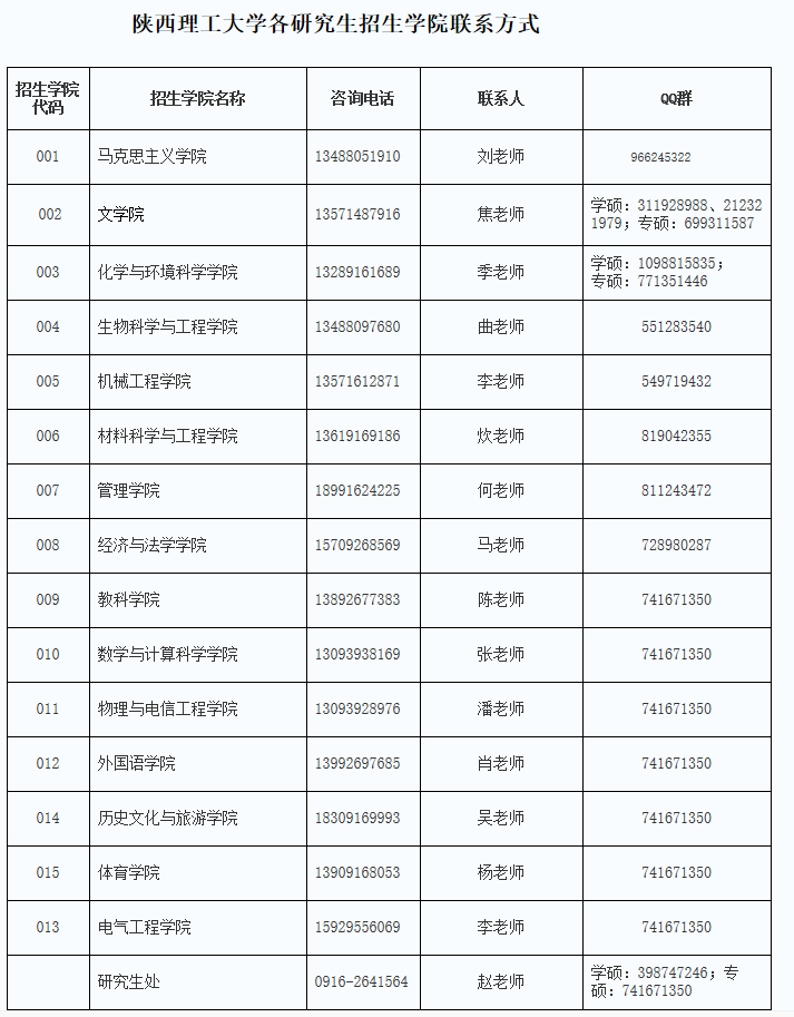 6.陜西理工大學(xué)各研究生招生學(xué)院聯(lián)系方式