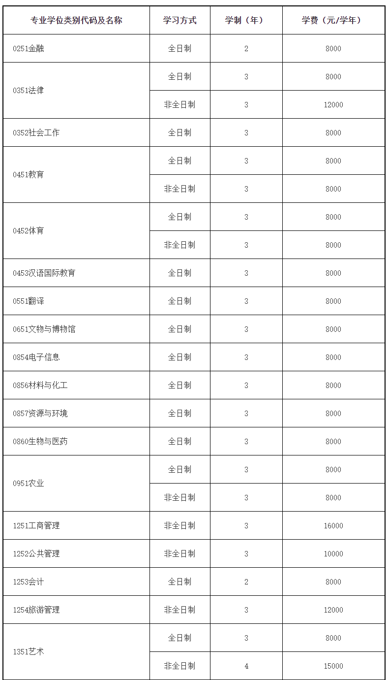 學術學位學習方式均為全日制,學制3年,每學年學費8000元。