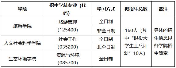 我校旅游管理、社會工作、資源與環境3個碩士專業學位的報考條件、招生對象、初試科目、學費標準、學習方式及學制等相關信息見各學院的招生簡章。
