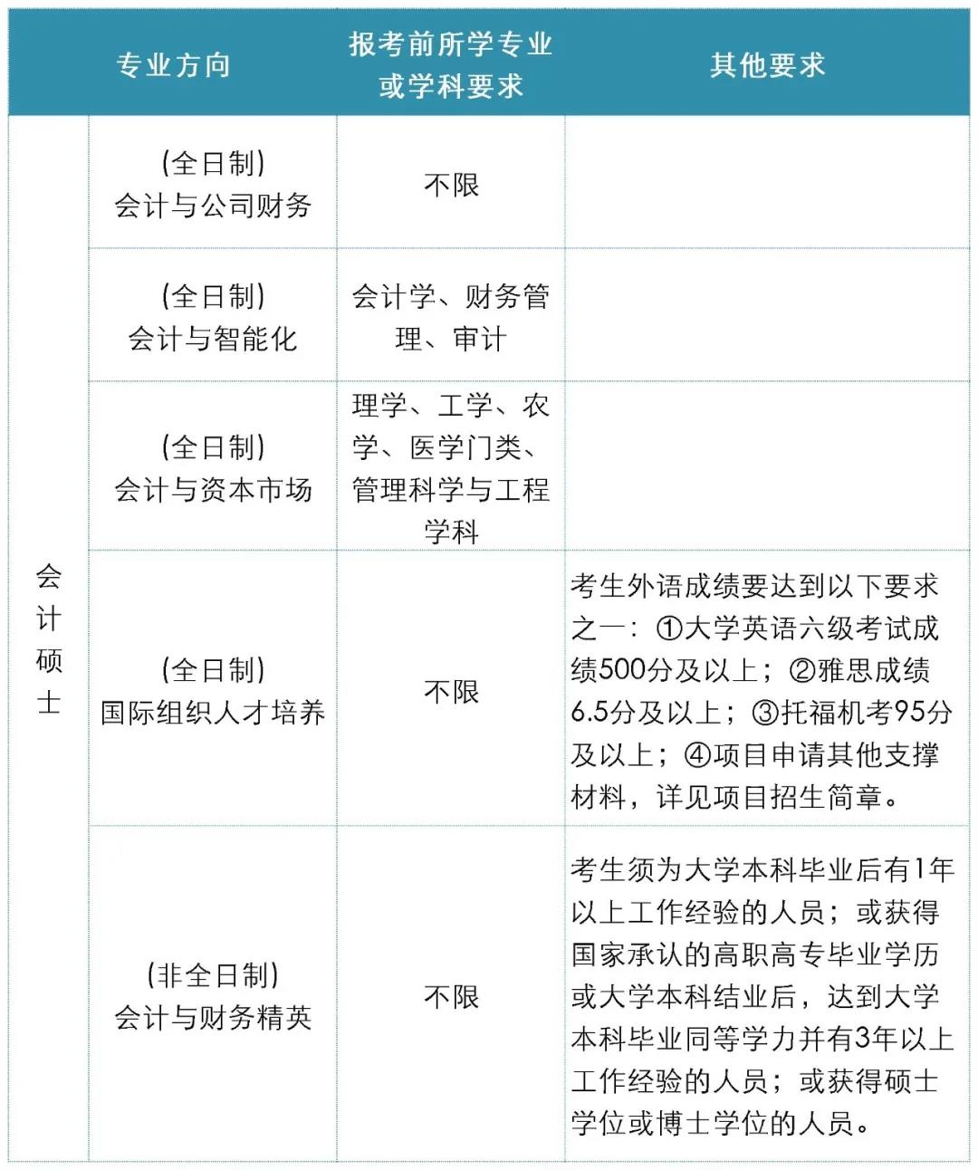 答:考生報名前,應當認真了解招生簡章中會計碩士各方向報考條件及相關政策要求,并嚴格對照本人報考前所學專業或學科選擇填報專業及方向志愿。報考會計碩士各方向要求參考下圖: