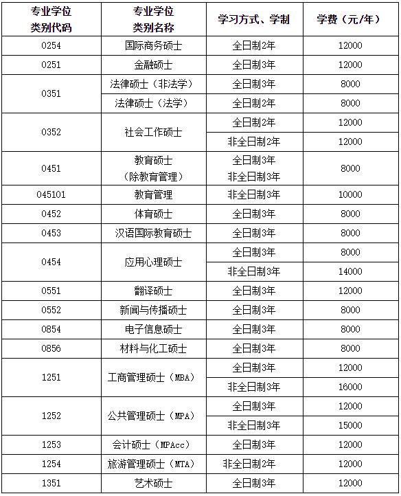 學(xué)術(shù)型碩士學(xué)習(xí)方式全部為全日制,學(xué)制3年,每學(xué)年學(xué)費(fèi)8000元;各專(zhuān)業(yè)型碩士學(xué)習(xí)方式、學(xué)制及學(xué)費(fèi)見(jiàn)下表: