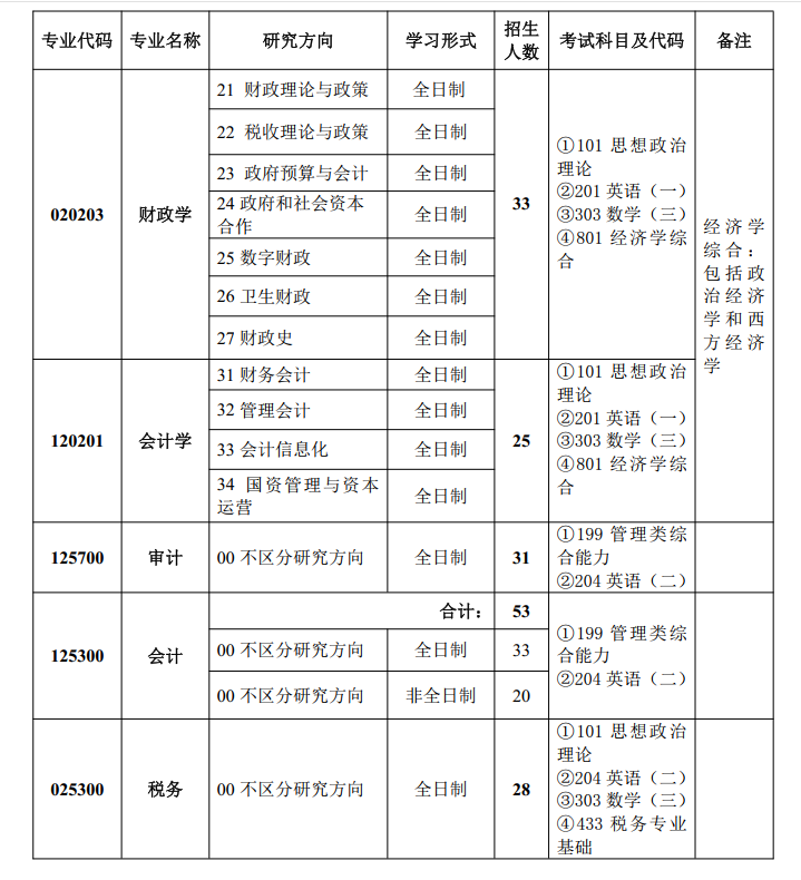 注:1.各專業(除非全日制會計專業)名額均含推薦免試生及少數民族骨干計劃生,其中推免生計劃招生名額分配:財政學6人、會計學5人(信息化方向2人)、審計6人、會計6人、稅務5人,若有剩余推免招生名額,將調配至統考招生使用。少數民族骨干計劃招生名額分配:財政學5人、會計學2人、審計5人、會計5人、稅務3人。少數民族骨干計劃招生事項詳見財科院《2024年“少數民族高層次骨干人才計劃”招收攻讀碩士學位研究生(全日制)招生簡章》。