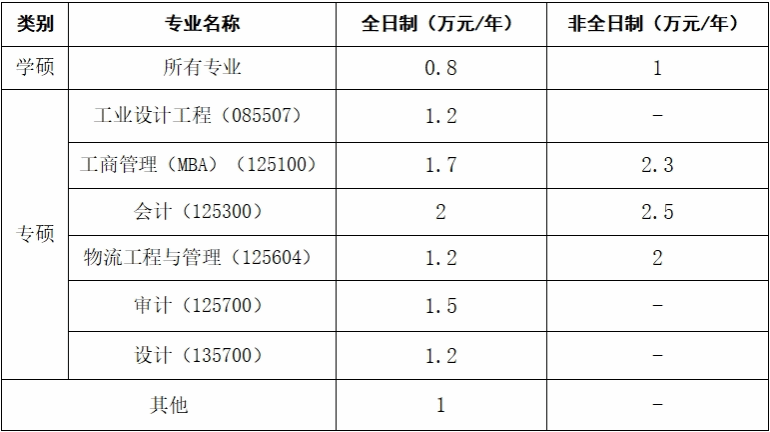 全日制研究生:學(xué)習(xí)方式為全脫產(chǎn),非全日制研究生:學(xué)習(xí)方式為全脫產(chǎn)或半脫產(chǎn);所有專業(yè)學(xué)制3年。收費(fèi)標(biāo)準(zhǔn)見(jiàn)下表:
