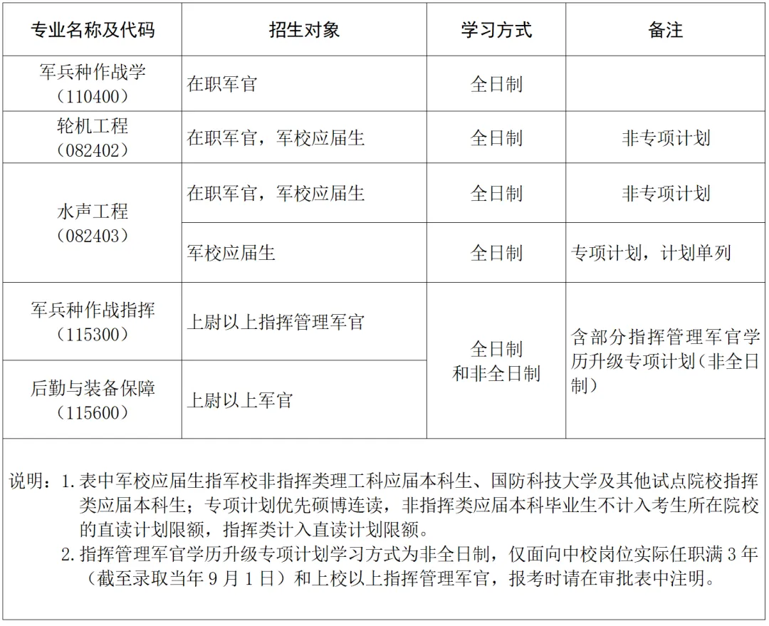 2. 專業(yè)學位(軍兵種作戰(zhàn)指揮、后勤與裝備保障)招收上尉以上軍官,其中專業(yè)技術軍官僅限報考后勤與裝備保障專業(yè)。專業(yè)學位部分非全日制指標用于指揮管理軍官學歷升級專項計劃,僅面向中校崗位實際任職滿3年(截至2025年9月1日)和上校以上的指揮管理軍官,具體指標請聯系學院招生辦。