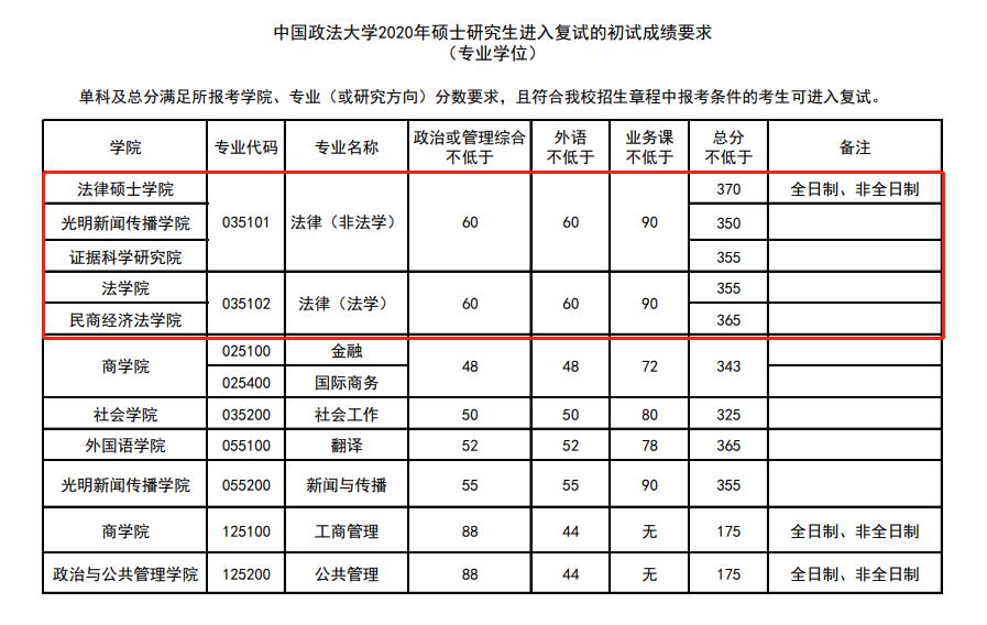 2020年中國政法大學(xué)法律碩士復(fù)試分?jǐn)?shù)線如下: