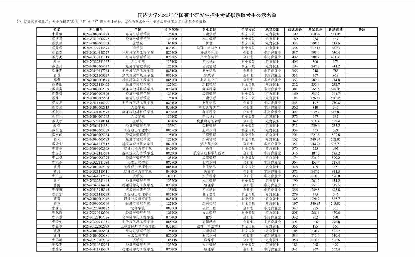 2020年同濟大學法律碩士非全日制錄取情況如下: