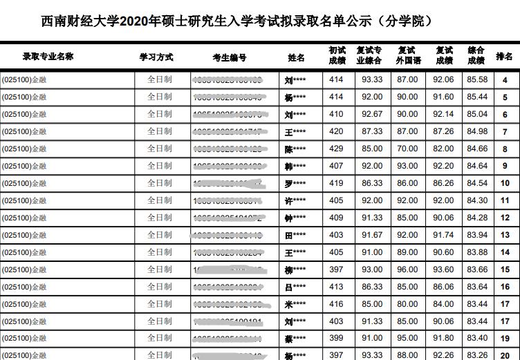 西南財經大學2020碩士研究生詳細擬錄取名單