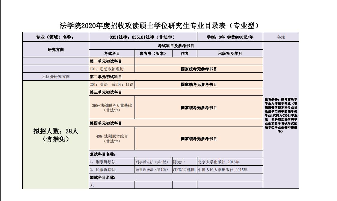 1.報考法律碩士(非法學)專業學位的考生,報考前所學專業為非法學專業(普通高等學校本科專業目錄法學門類中的法學類專業[代碼為0301]畢業生、專科層次法學類畢業生和自學考試形式的法學類畢業生等不得報考)。