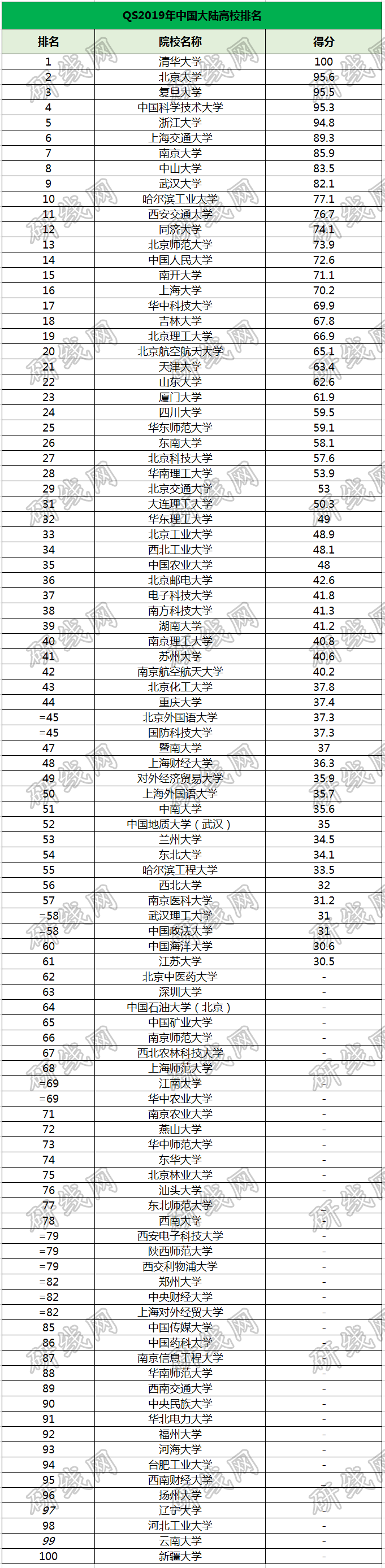 QS2019年中國(guó)大陸大學(xué)排名名單和得分表