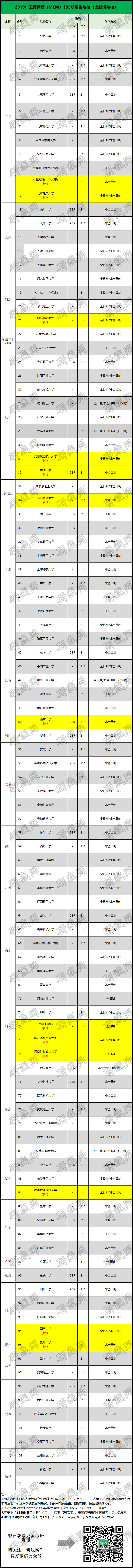 2019年工程管理(MEM)105所招生院校(含新增院校)如表所示: