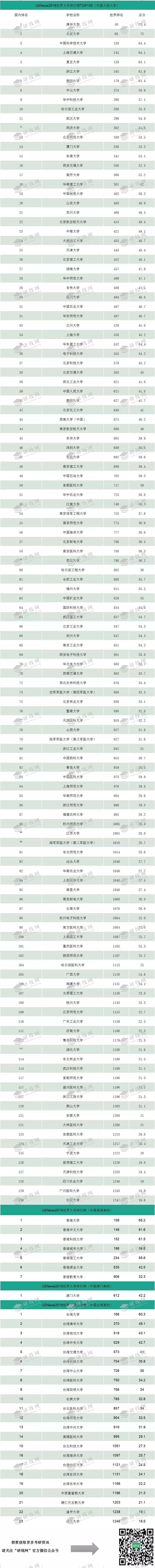 中國共有161所高校入圍 USNews 2019世界大學排行榜,排名表現不俗。其中內地高校130所,香港高校7所,澳門高校1所,臺灣高校23所。不過,相較去年,中國高校整體排名有所下降。今年,中國內地上榜高校相比去年減少6所。清華大學排名全球第50位,比去年進步14位,居內地高校第一。北京大學緊隨其后,排名全球第68位,居內地高校第二。清華和北大也是僅有的2所入圍全球前100名的中國高校。