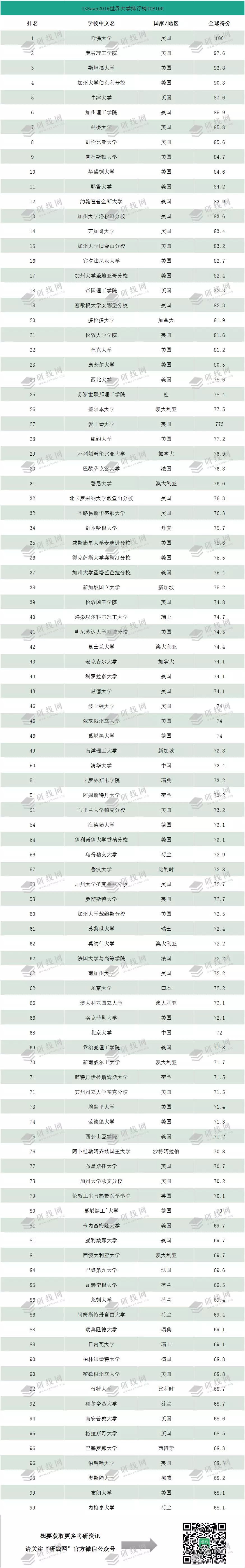 TOP100高校中,美國高校共有46所,英國高校共有12所,澳大利亞和荷蘭各有7所,德國和瑞士各有4所,這些國家上榜高校較多。中國僅有2所入圍TOP100,相比上述國家,特別是美國和英國還有很大差距。USNews2019世界大學排行榜TOP100高校詳細名單如下: