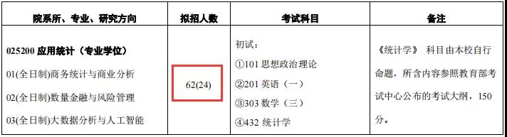 2022年應(yīng)用統(tǒng)計(jì)碩士專業(yè)計(jì)劃招生全日制62人,包括推免人數(shù)24人。