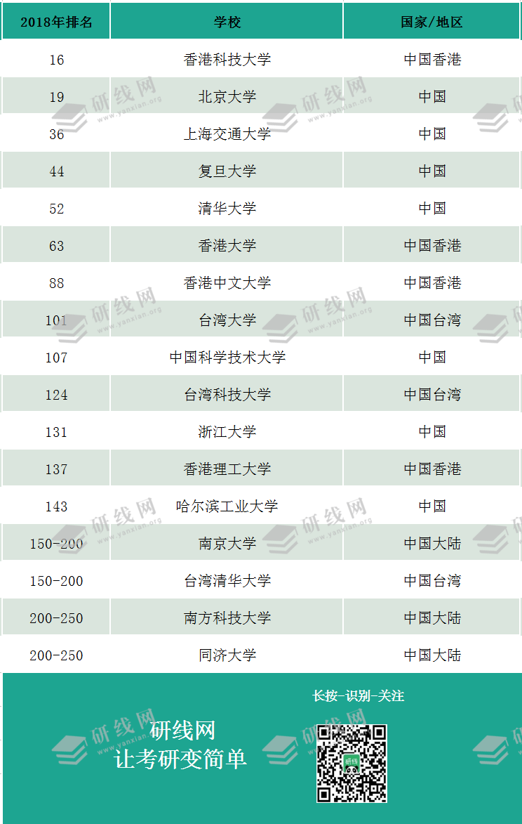在這次公布2018年全球大學畢業生就業能力排行榜單中,我們可以看到:中國高校表現平穩,在上榜的前250所高校中有17所中國高校,其中中國大陸10所,中國香港4所,中國臺灣3所。