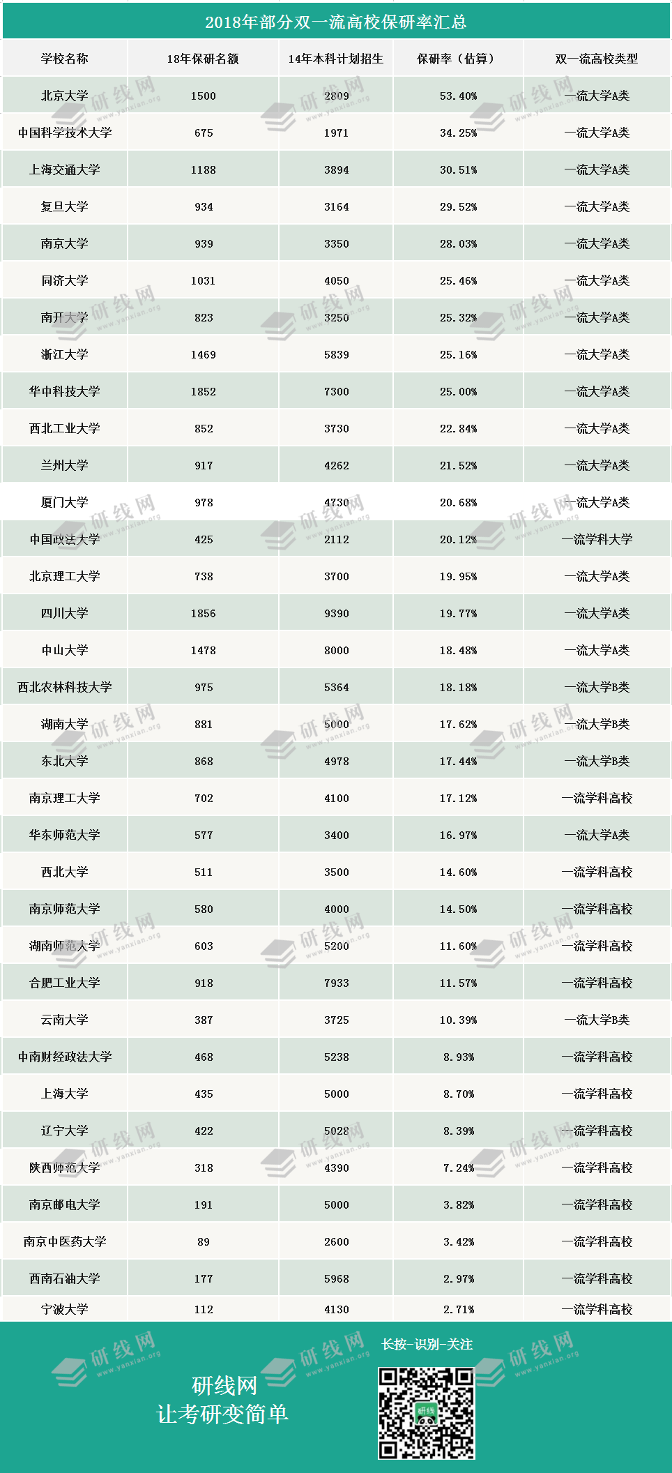 2018保研率可以這樣估算:2018年保研名額/2014年錄取人數進行估算。其中2018年保研名額來源于教育部下達各校的名額或各校公示的2018年推免生全名單;2014年錄取人數為各校2014年本科生招生計劃人數。( 注 :存在個別5年制專業和個別本科生退學,或者有些學校不公布推免名單等情況,因此實際數據可能會有一些偏差或不完整,僅供參考。)