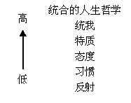 Allport認為人格是個體內在的心理生理系統的動力組織,決定著個人獨特的思想和行為。人格具有復雜的結構,由反射、習慣、態度、特質、統我等整合程度高低以金字塔式層級形式構成。如圖:
