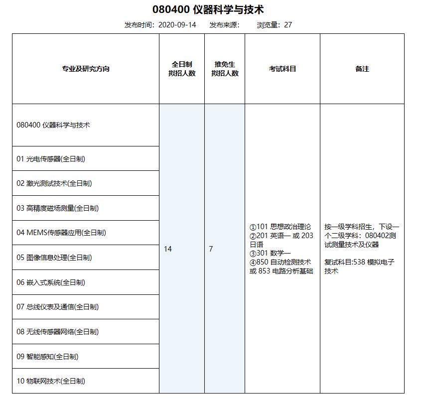 2021考研專業目錄:北京科技大學自動化學院080400 儀器科學與技術2021年碩士研究生招生專業目錄
