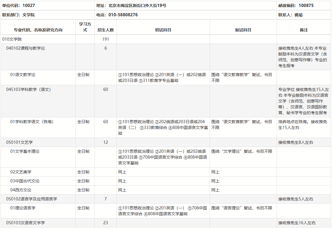 以上就是2025考研專業目錄:北京師范大學文學院2025年碩士研究生招生專業目錄的全部內容!祝您考研成功!更多相關信息請持續關注本網站!