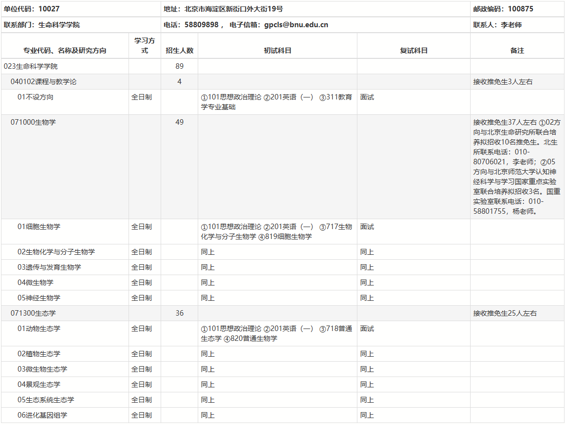 以上就是2025考研專業目錄:北京師范大學生命科學學院2025年碩士研究生招生專業目錄的全部內容!祝您考研成功!更多相關信息請持續關注本網站!