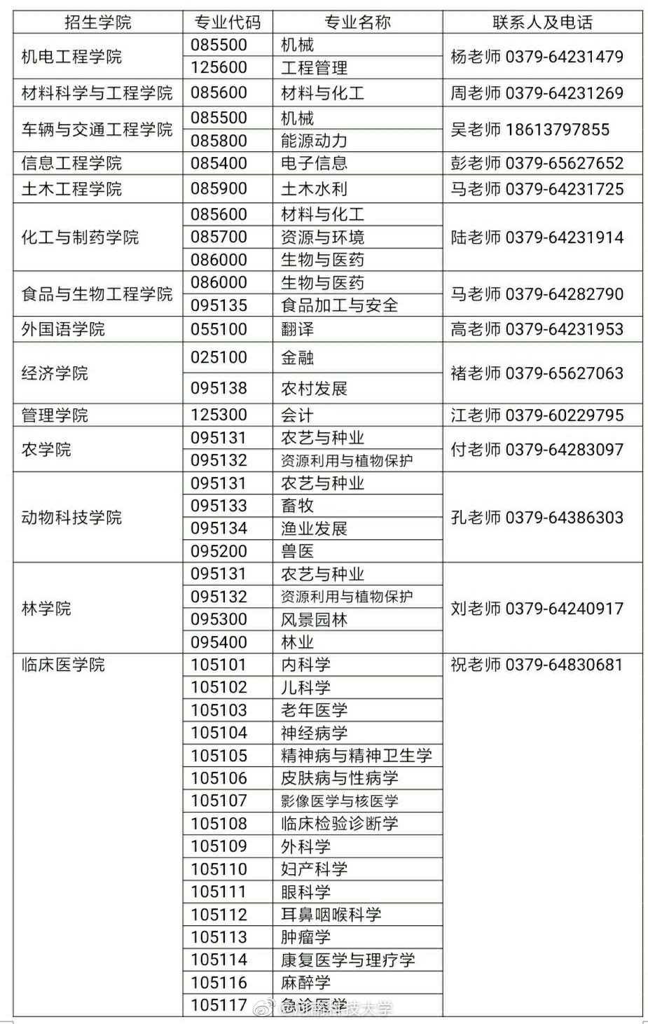 河南科技大學2020年全日制專業學位碩士研究生招生專業目錄